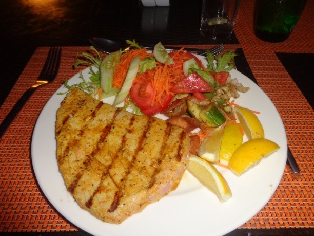 In the evening I walked down the beach to the Crowne Plaza for dinner by the sea. The first night it was an Asian Buffet and I had a delicious Tuna Steak with Salad cooked to order.