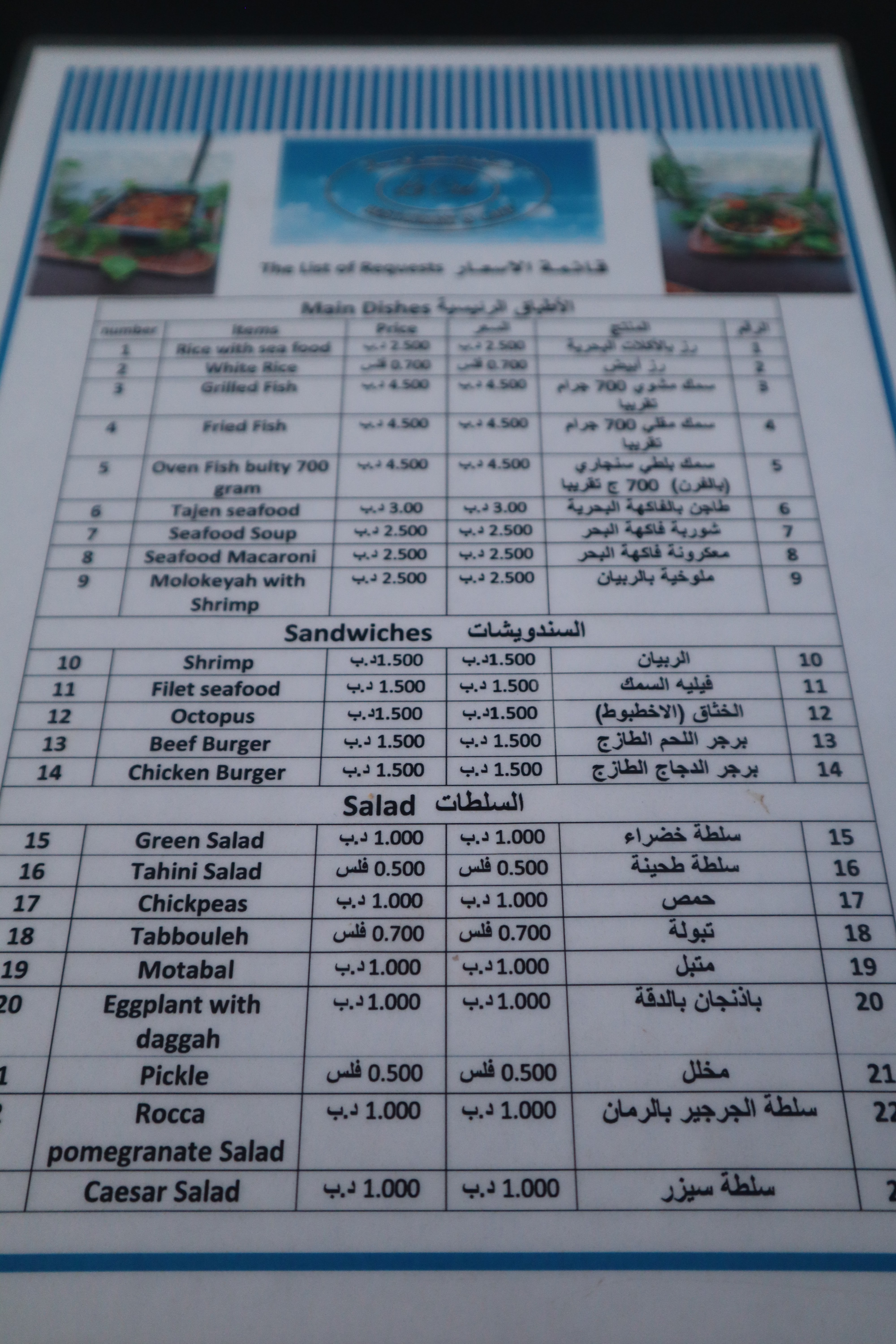 Eventually we finished and declined their offer of coffee, and I was amazed that the total bill was only 12 bd. I would highly recommend this place which is open from 10 am to 10 pm daily at the far end of the Bussatein Seafront. They have an Instagram page and the menus are below. Everything is cooked freshly as we were the only customers so do not expect fast food!